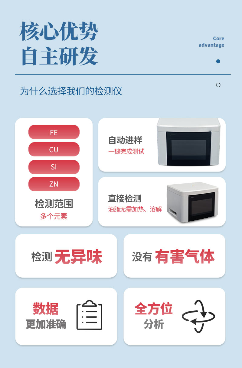 润滑油脂直接放进油盒进行检测,无需对油脂进行加热、溶解等步骤,不破坏样品。全程检测无异味、无有害气体,无需放置于通风橱,对试验人员的健康提供了保障;