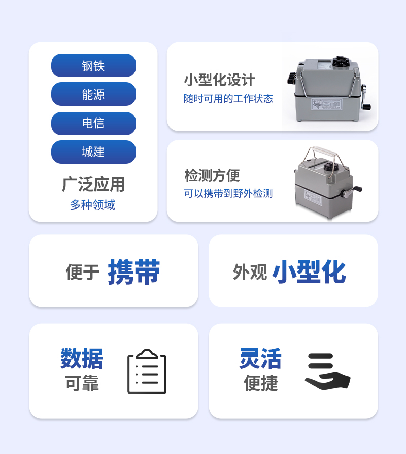 该测试仪根据土壤腐蚀与防护野外测试工作多年的经验,将所需要用的三十种五十六个各类仪表、电极、试剂、用具等加以重新设计和组合,使之小型化,并且处于 随时可用的工作状态,组装在两只小型测试箱中。便于携带到野外,现场完成与土壤腐蚀与防护有关的十个项目的分析和测试。方法合理,数据可靠,灵活便捷。